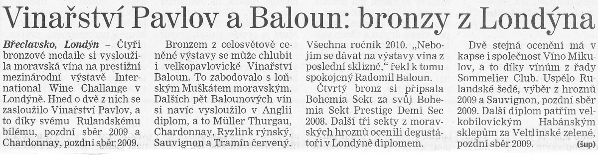 Na mezinárodní soutěž v Londýně bylo šest našich vín z ročníku 2010 oceněno medailí.