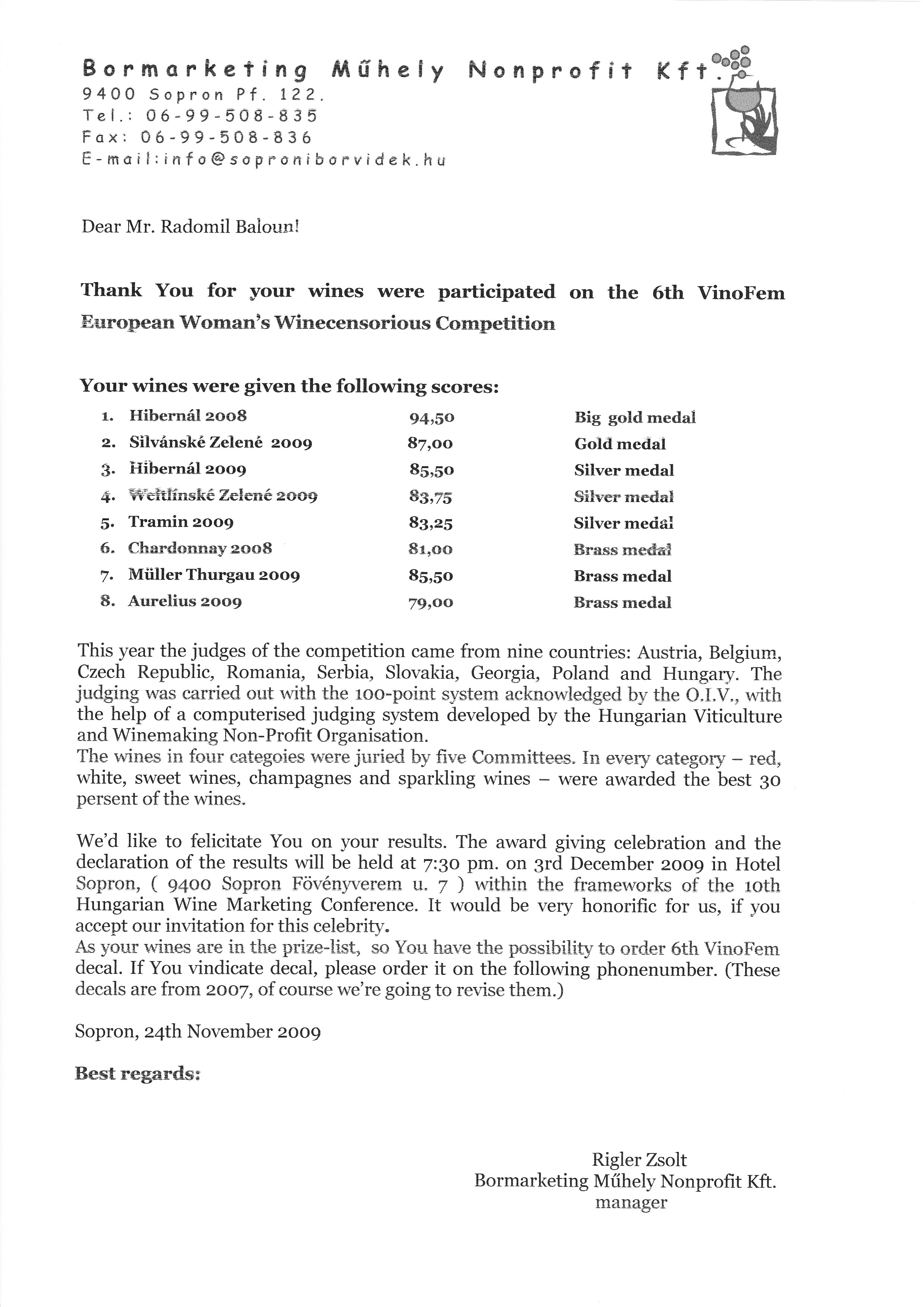 Na mezinárodní soutěži v Maďarském Šoproni, která se koná jednou za dva roky a hodnotí zde pouze ženy degustátorky světových jmen, získala naše vína významná ocenění. Hibernal pozdní sběr 2008 získal velkou zlatou medaili a stal se tak šampionem této výstavy.
